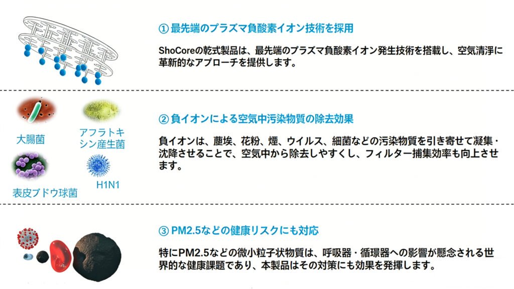 コアメイトジャパンは環境科学に基づいた空気清浄製品を提供し、2026 年に台湾製乾式タイプのエアクリーナー(プラズマボール マイナス酸素イオン)シリーズと、湿式タイプの消臭抑菌液剤(天然植物抽出酵素消臭液)シリーズを発売する予定です。
