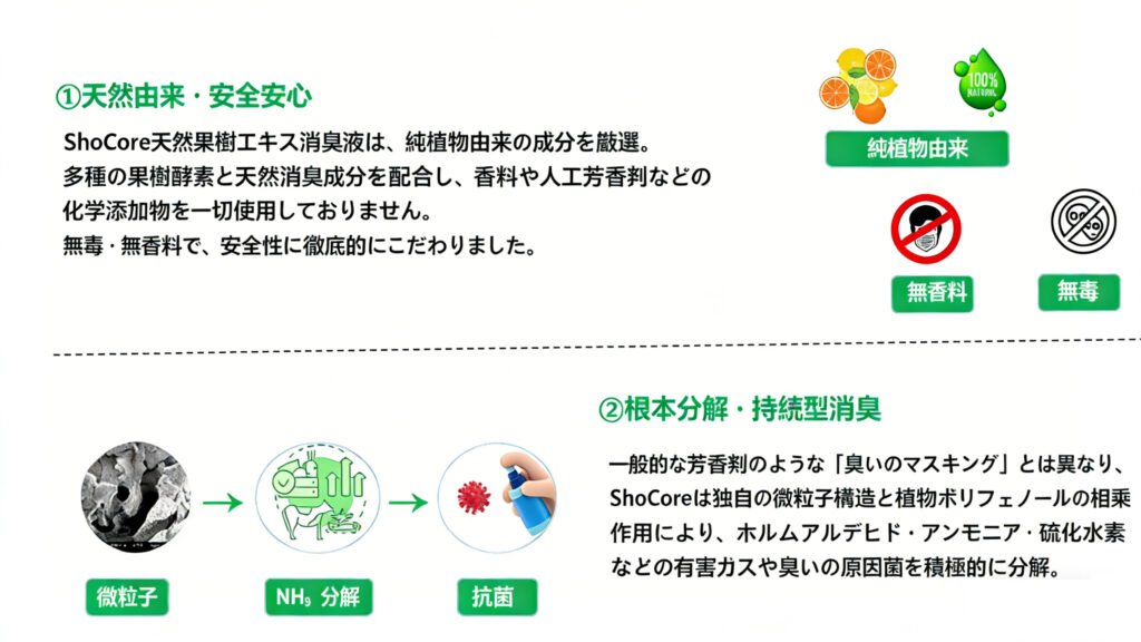 天然植物抽出酵素消臭液製品は、植物由来の天然成分を抽出して開発された消臭液です。異臭・悪臭を除去するだけでなく、細菌やカビの繁殖を抑制します。