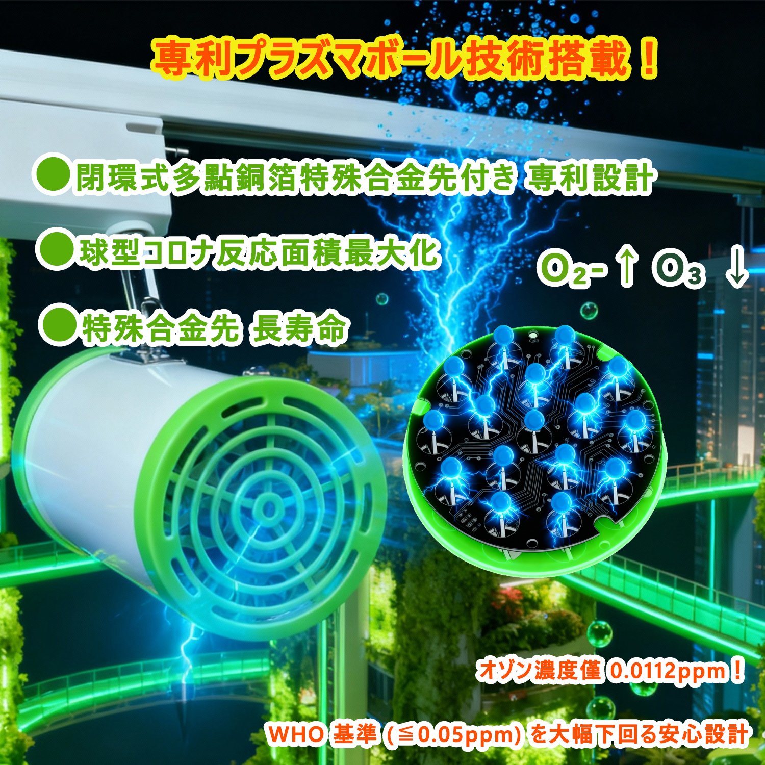 •プラズマボール 技術によるナノ レベル高濃度 マイラス イオン (1000 万 pcs/cm³)